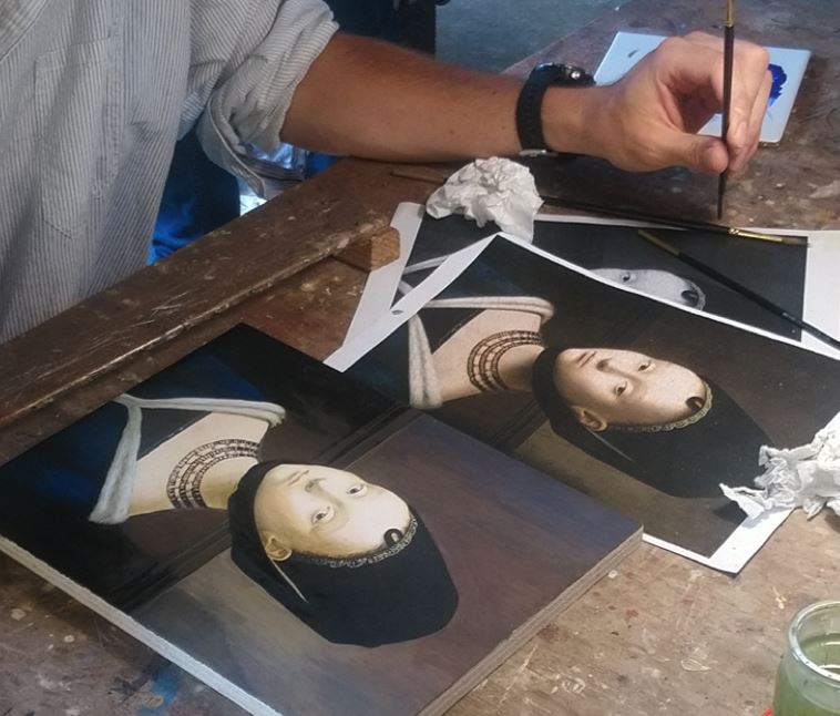 Encore au programme le stage de techniques des peintres de la fin du Moyen-Âge et du dé-but de la Renaissance. L’accent est mis sur la technique mixte huile-détrempe sur bois, peinture réalisée avec une tempéra à l’œuf et des glacis à l’huile. Glacis sur lesquels alors qu’ils sont encore frais, la tempéra intervient à nouveau.